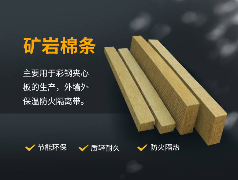 礦巖棉條用較高強(qiáng)度礦巖棉板切割而成,主要用于彩鋼夾心板的生產(chǎn),外墻外保溫防火隔離帶。